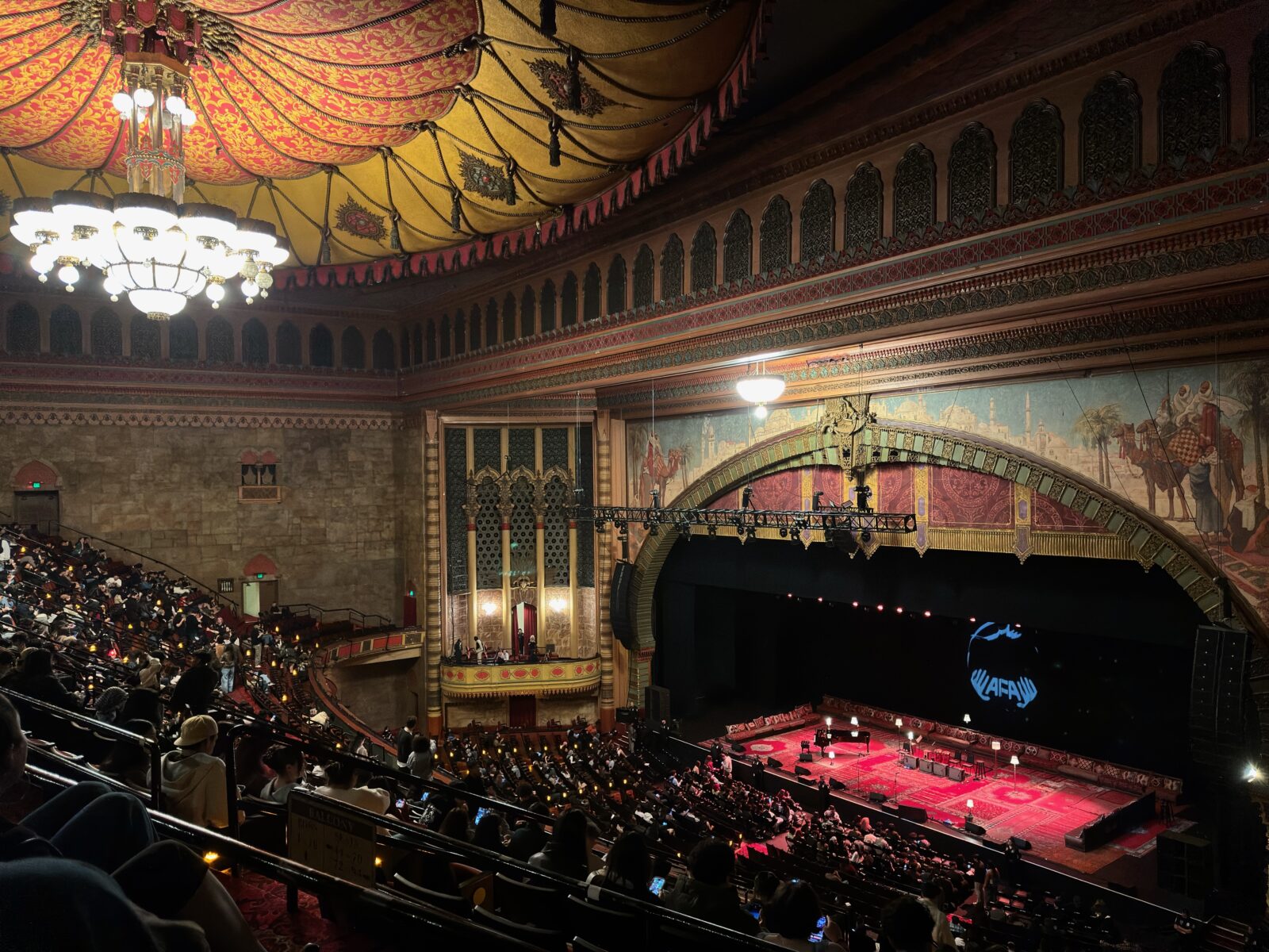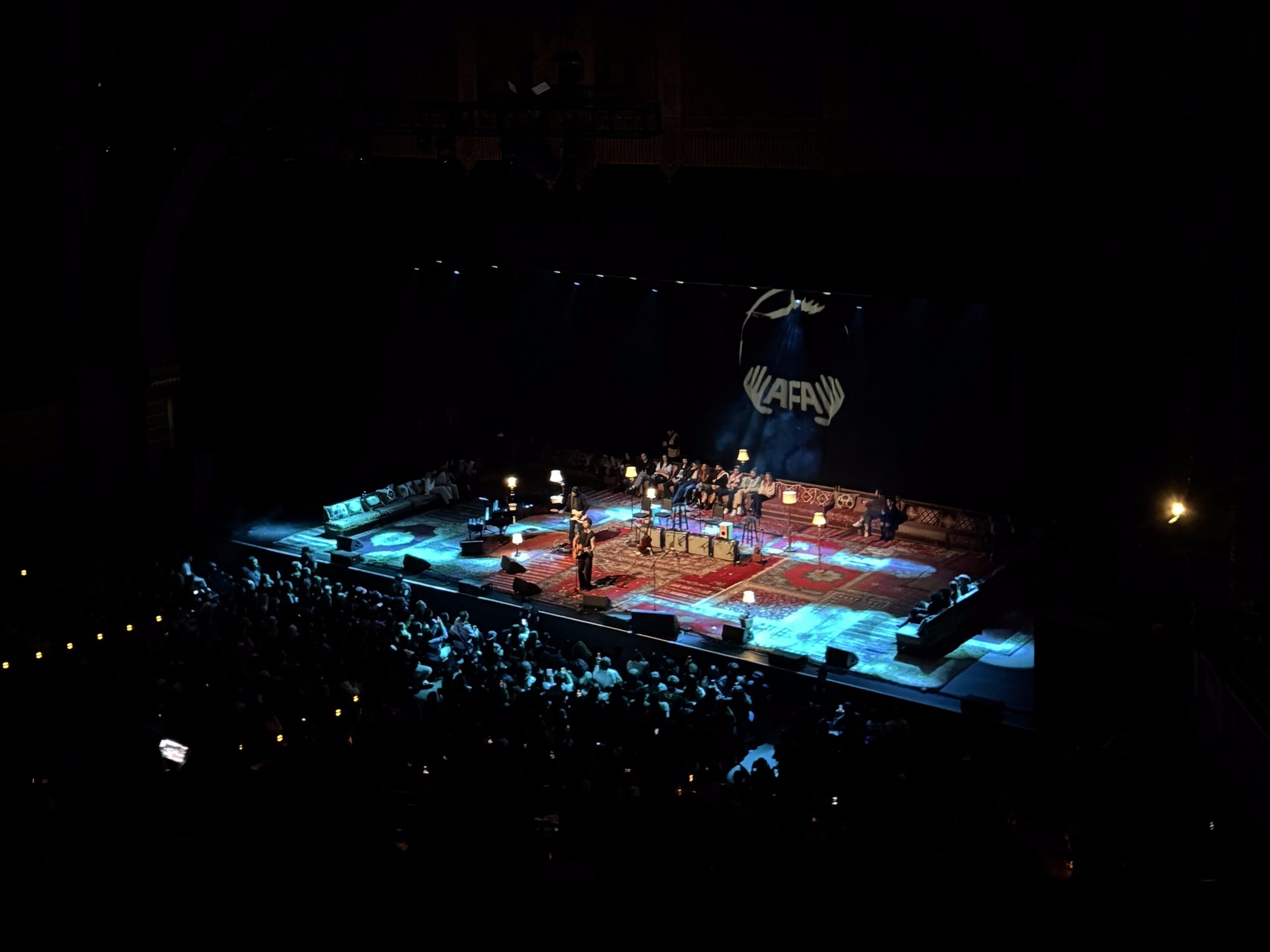 The somber mood of the event was achieved by the venue’s opulent ornamentation and fantastic set design. Inside, a large chandelier warmly lit up the venue, accompanied by large drapes pulled back from the stage. The placements of each lamp, sofa, rug and microphone complimented each other as the stage was presented as a homely Arabian lounge where artists would sway to the music and converse as the audience faced them. A single piano sat on the left side, dominating the stage, surrounded by large sofas. Actors, musicians, artists and humanitarian music lovers gathered in one space of music to aid the people of Palestine and Sudan.
