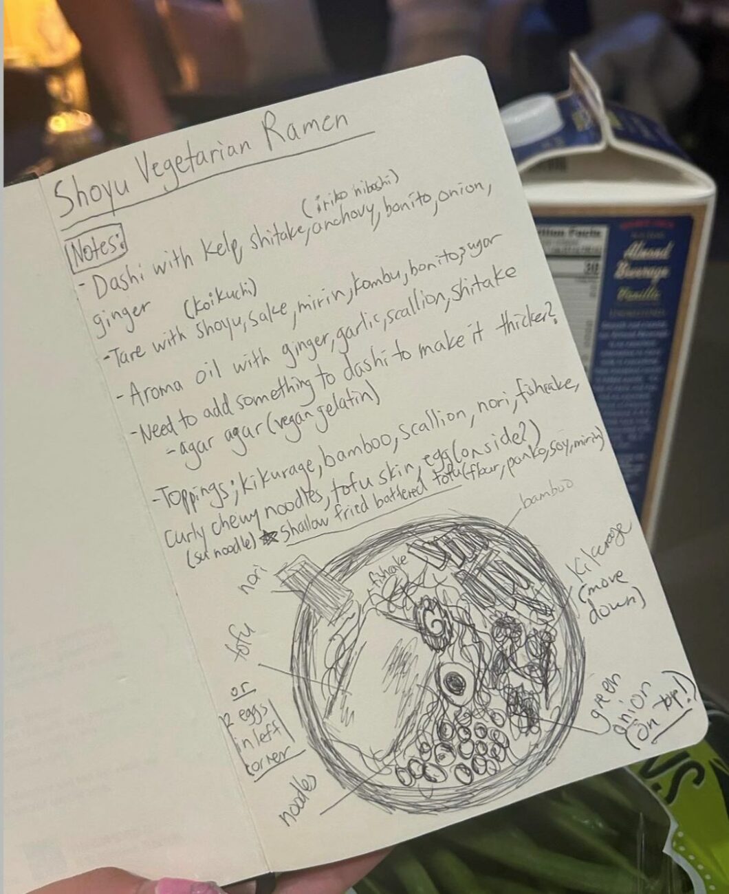 Working as a line cook in an authentic ramen restaurant as a senior in high school is one instance that inspired her recent creative attempt to make shoyu ramen void of all animal products.