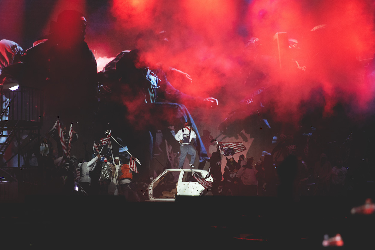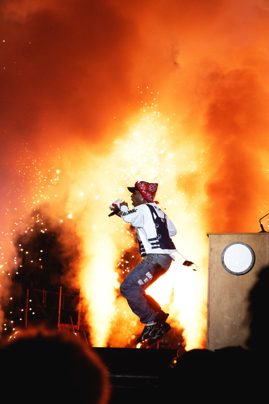 His set also included hits like “A$AP Forever,” “Riot,” to “Praise The Lord(Da Shine),” which he performed live with Skepta for the duet song, with a raging set filled with flames and the American flag as a motif.