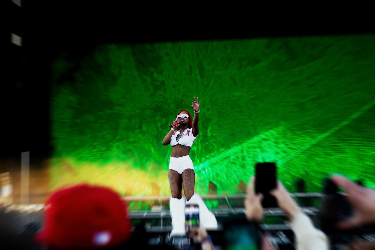 “This song got me out the trenches with you all, so I need y’all to sing along,” Sexyy Red said. She then started a verse a cappella, “it goes a little something like this, ‘I’m outta town, thuggin’ with my rounds.”