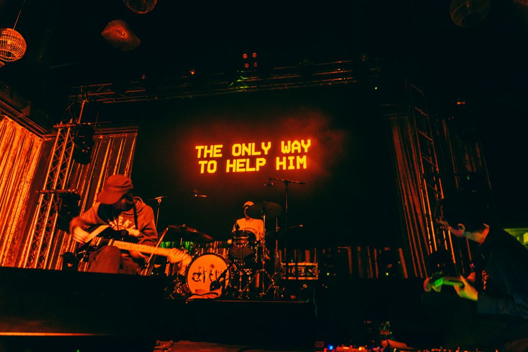 Absurdity was a highlight of DIIV’s show, as their fuzzy guitars were broken up by intermittent videos of uncanny valley-looking actors monologuing in corporate-speak gibberish. During their songs, a collection of found footage, TV static and lyrics played over a red screen.