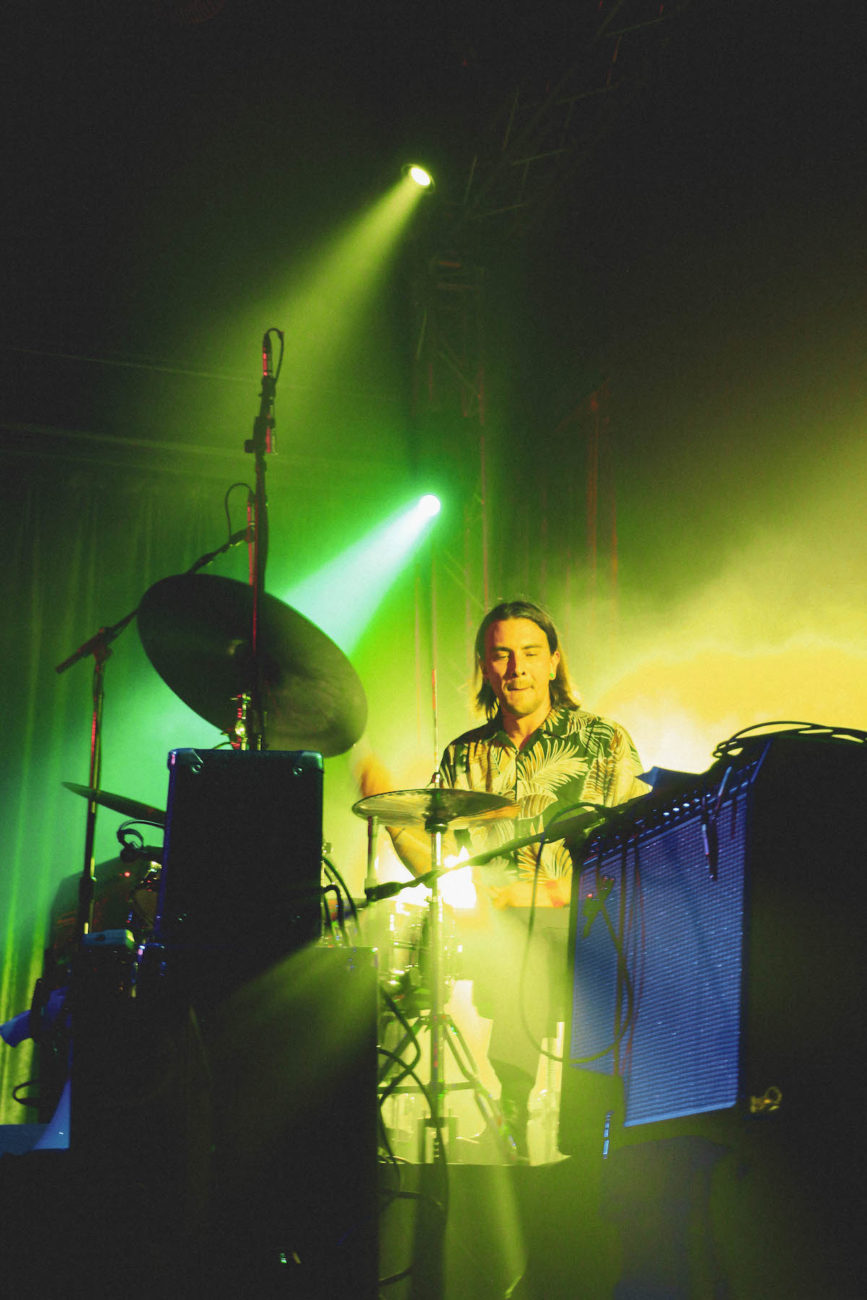 The band’s first song “El camino negro” began with the psychedelic sound of Guerrero’s guitar, before the drums and congas came in to complete the surf rock sound. Behind the band, looping visuals of a car, an animated skateboarder and various patterns played on the big screen, complimenting the reverb-heavy music.