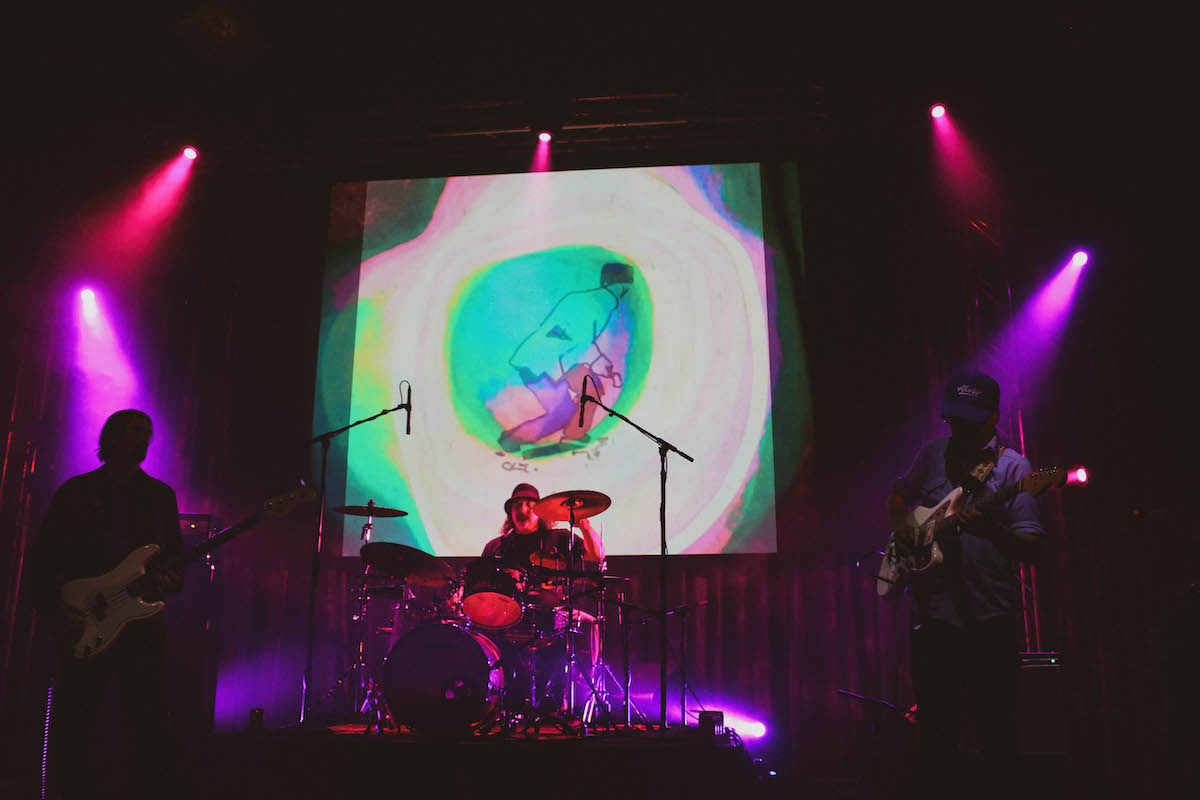 The band’s first song “El camino negro” began with the psychedelic sound of Guerrero’s guitar, before the drums and congas came in to complete the surf rock sound. Behind the band, looping visuals of a car, an animated skateboarder and various patterns played on the big screen, complimenting the reverb-heavy music.