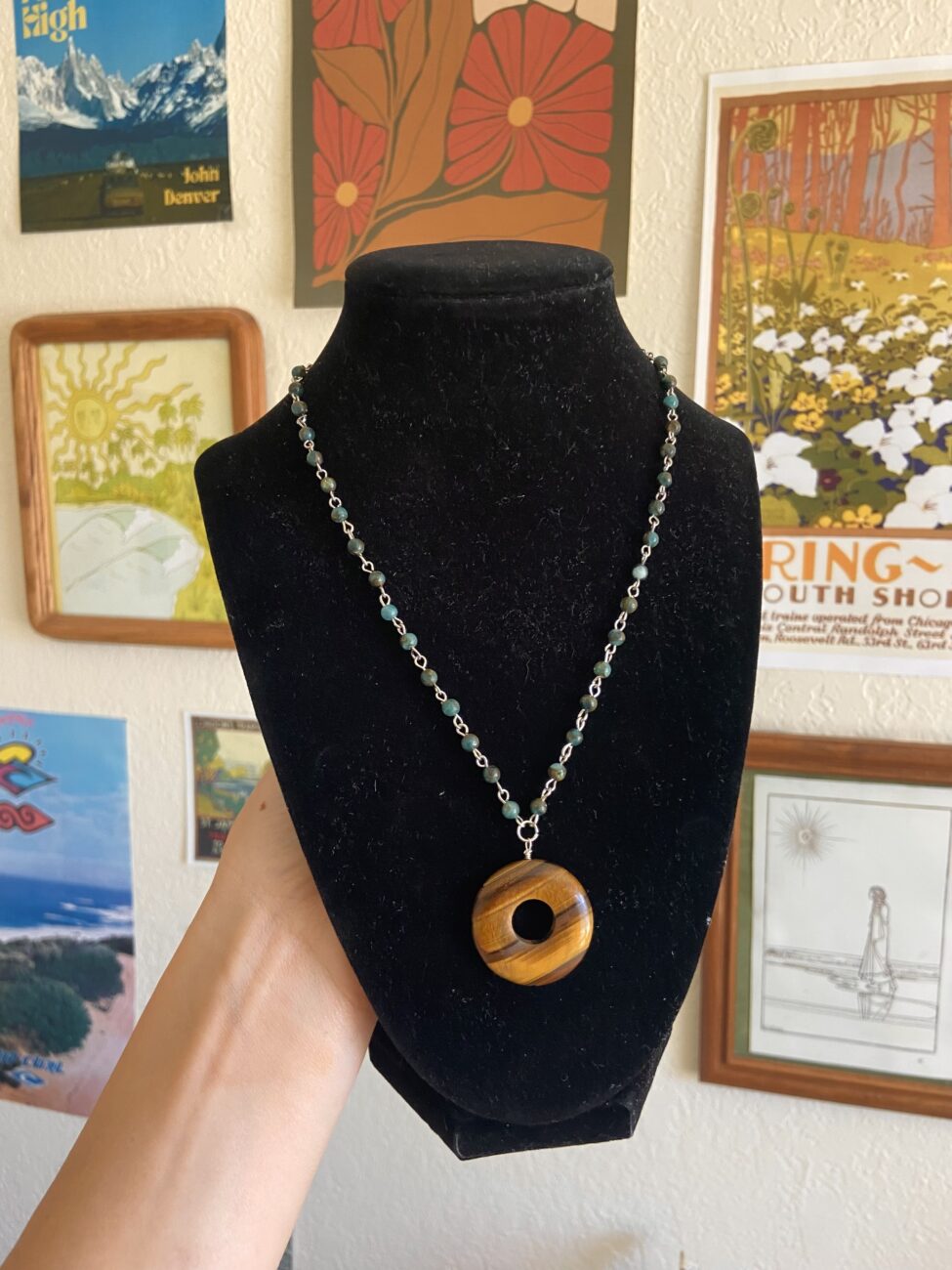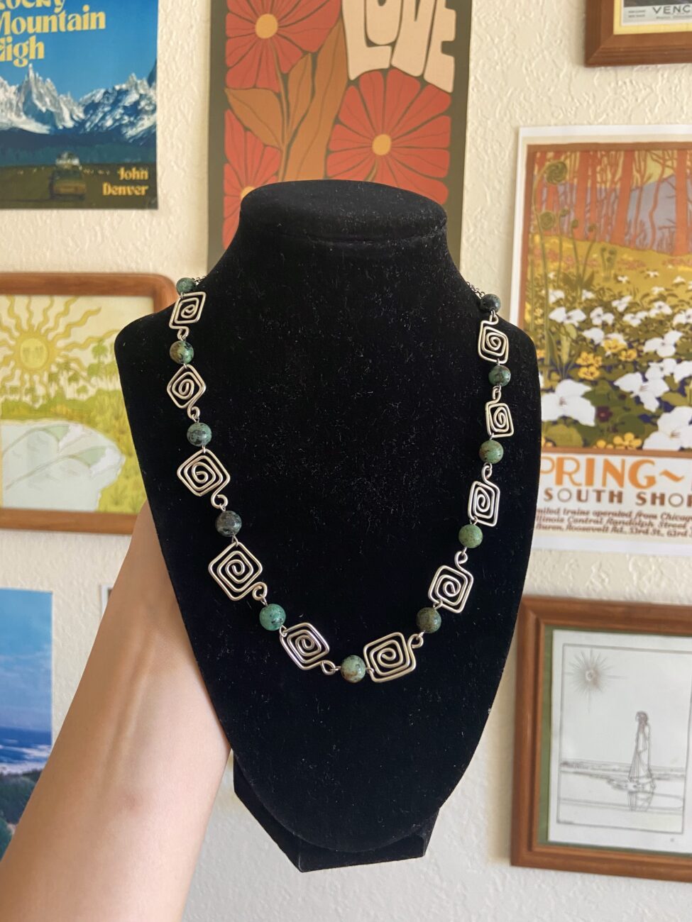 A spiraled waist chain with turquoise beads and a tiger’s eye necklace are just two of the statement pieces she created to sell at club-sponsored markets leading up to Shabang 2025.